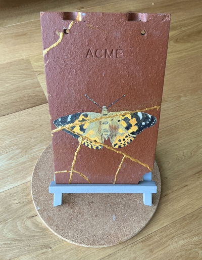 One of the roof tiles I painted butterflies on fell off our fence the other day and broke. I thought this was an opportunity to try kintsugi, the Japanese art of repairing ceramics with visible gold joints. Sort of OK for a first attempt, I think. However, it probably can’t go back outside which leaves me with a decision about whether I should paint a replacement, and if so whether it should be the same butterfly (a Painted Lady) or a different one?