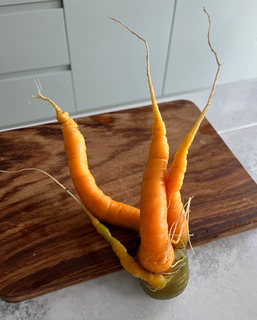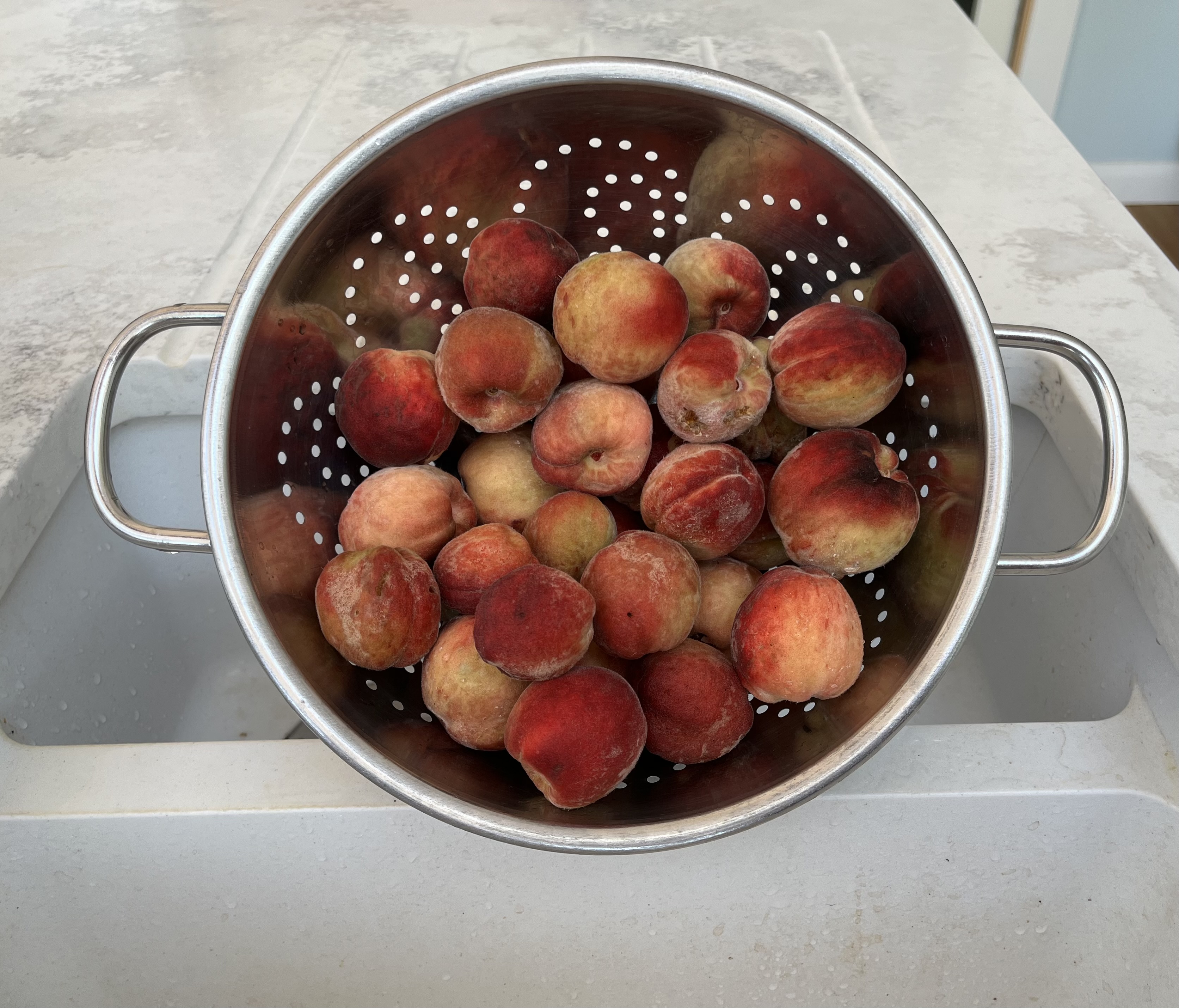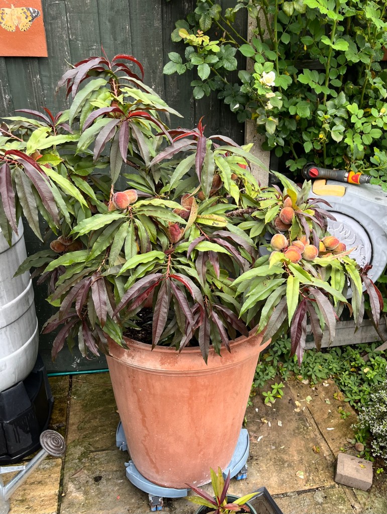 The mini peaches from our mini peach tree still feel quite firm, but they are a good colour and have started to drop off the tree of their own accord (I blamed the foxes at first), so they have to be picked. They are in fact ready to eat – I think they might be nice grilled with a bit of crème fraîche or similar.