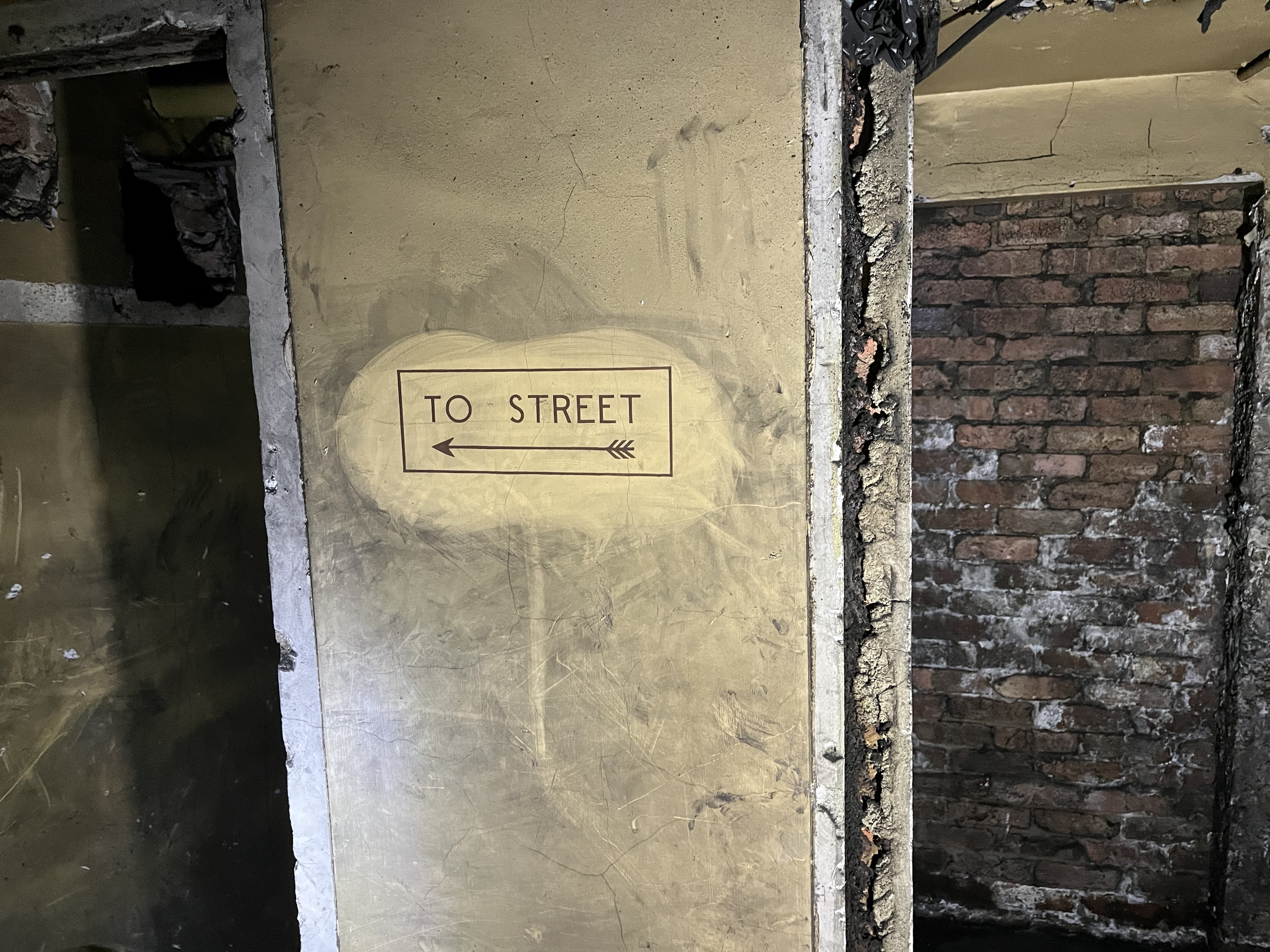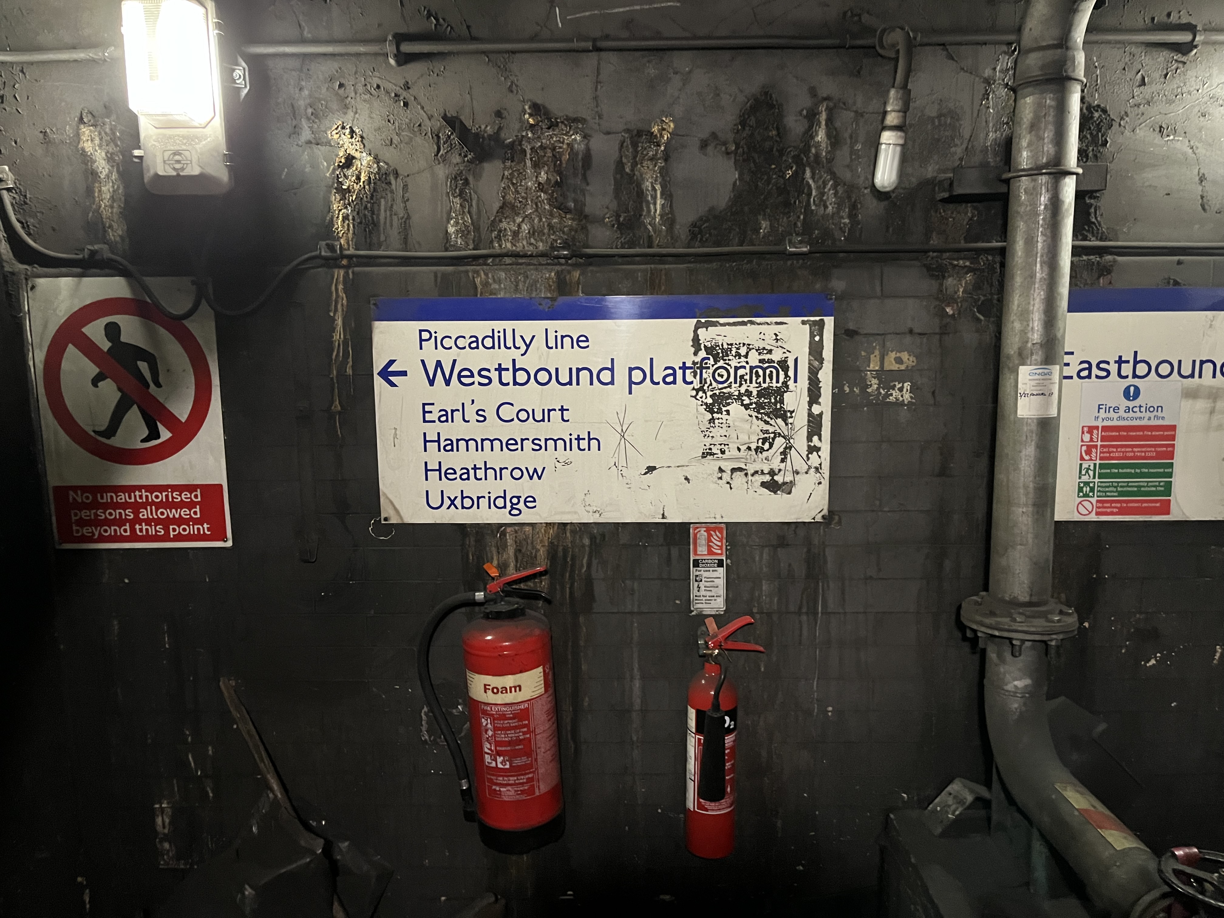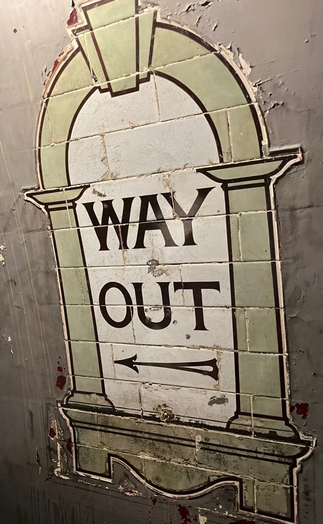 These days it is a bit of a wreck. The platforms were walled off in 1939, but the trains can still be heard, and seen flashing by in a few places. Odd bits of signage from different eras are still in place, and some of the fine old tiling. It seems odd to me that a space like this in the most expensive part of London is not more imaginatively used.