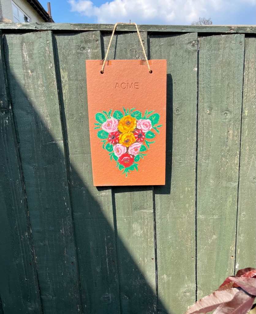 We had some roof tiles (Acme brand, of course, suitable for dropping on the head of Wile E Coyote) left over from our recent building project. I thought I might try painting some with the kind of flower design that is the traditional decoration for narrow boats.